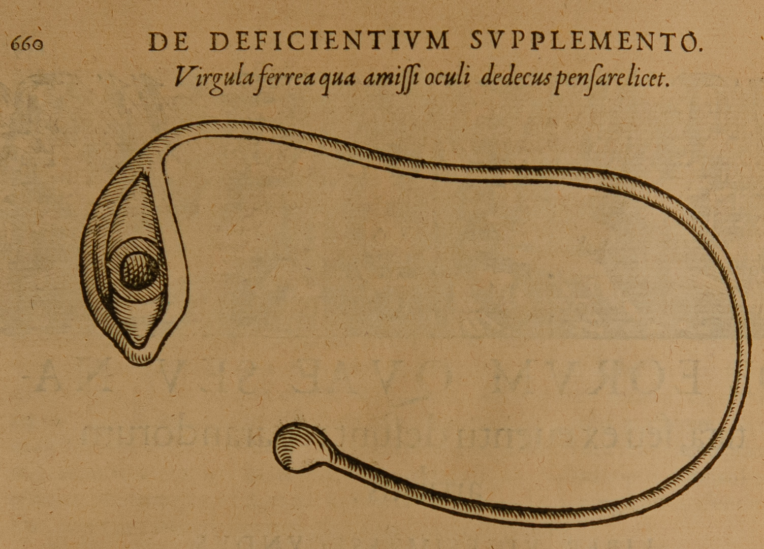 Si tratta di un occhio finto inserito in un sostegno di ferro incurvato che veniva fatto passare dietro l'orecchio